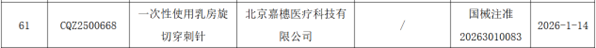 2025年12月底,26年初,北京嘉橞医疗科技有限公司研发生产的两款三类医疗器械——“一次性使用乳房旋切穿刺针”相继获批上市!