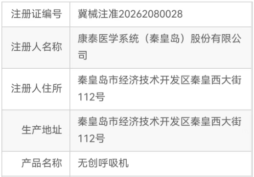 2026年1月28日,由康泰医学系统(秦皇岛)股份有限公司研发生产的医疗器械——“无创呼吸机”获批上市!