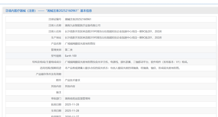 2025年11月28日,湖南九辰智能医疗设备有限公司“广域视网膜屈光度地形图仪”获批上市——【湘械注准20252160961】。