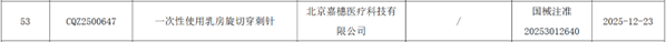 2025年12月底,26年初,北京嘉橞医疗科技有限公司研发生产的两款三类医疗器械——“一次性使用乳房旋切穿刺针”相继获批上市!