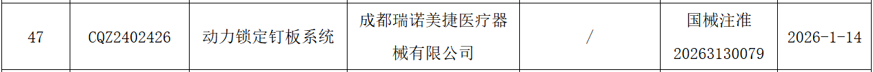2026年1月14日,由成都瑞诺美捷医疗器械有限公司研发生产的三类医疗器械——“动力锁定钉板系统”获批上市!